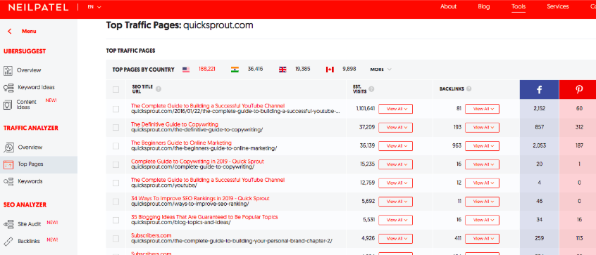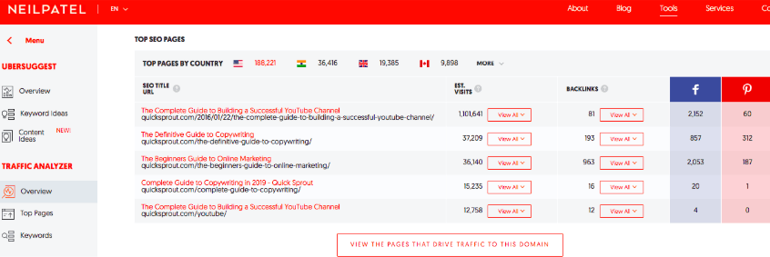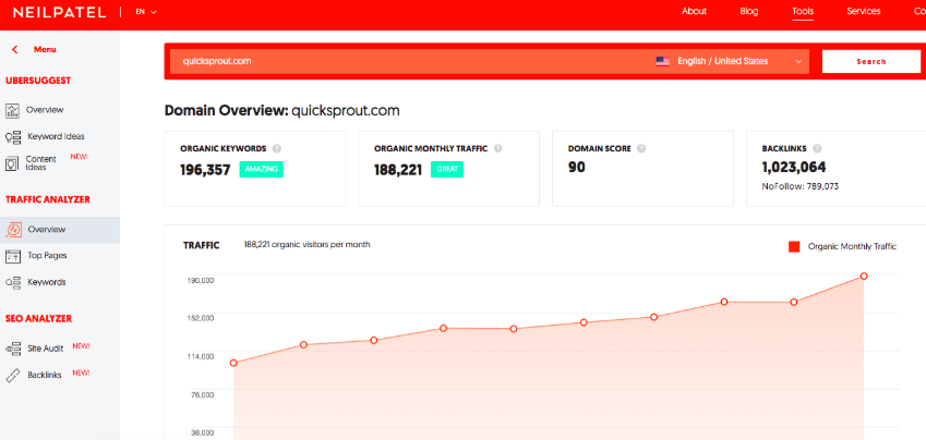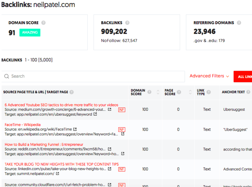Supposing you’re in the digital marketing niche and you’re competing with Neil Patel. You can enter Neil Patel’s website URL in Ubersuggest’s SEO Analyzer, specifically, in the “Backlinks” feature