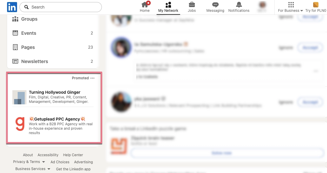 Turning Hollywood Ginger et Getuplead PPC Agency diffusent tous deux des annonces textuelles classiques sur LinkedIn, placées sur le rail réservé aux ordinateurs de bureau. Ces formats compacts utilisent un titre en gras et une brève description pour attirer l’attention sur la marque ou les visites de sites web.