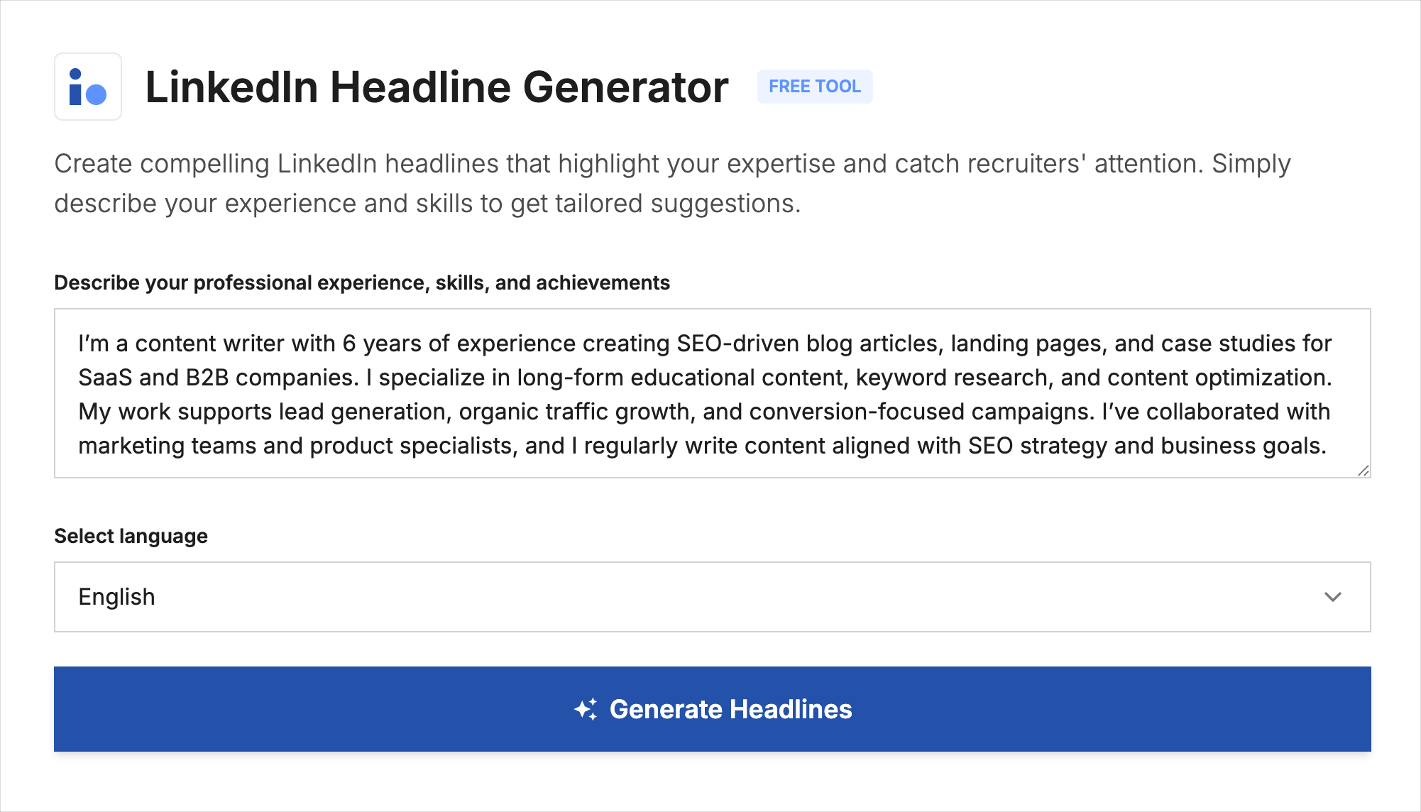 Click Generate Headlines to receive multiple LinkedIn headline options based on your description and selected language.