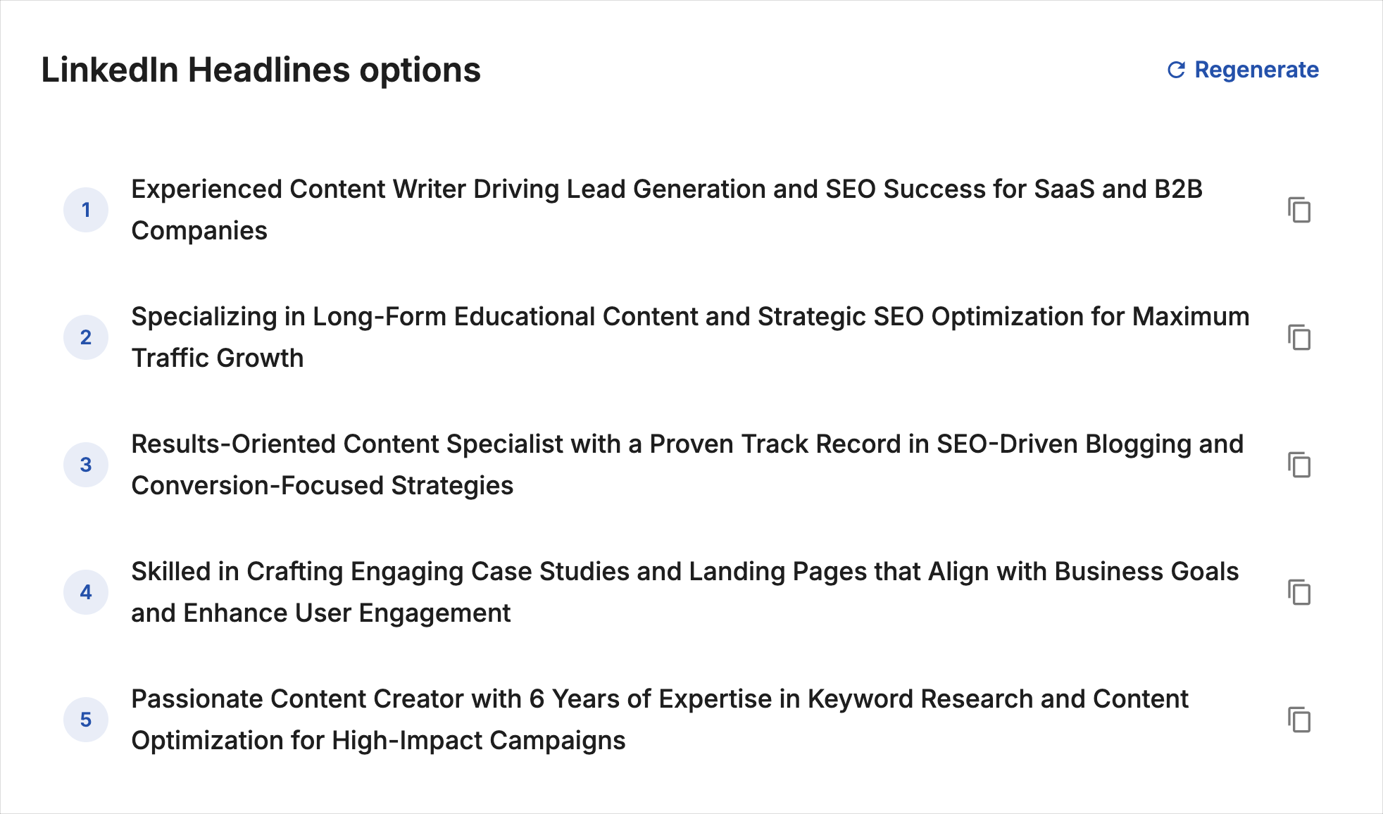 Review the generated headlines, choose the one that best reflects your role and goals, and adjust wording if needed. You can regenerate headlines at any time by refining your input or adding clearer achievements, numbers, or keywords.