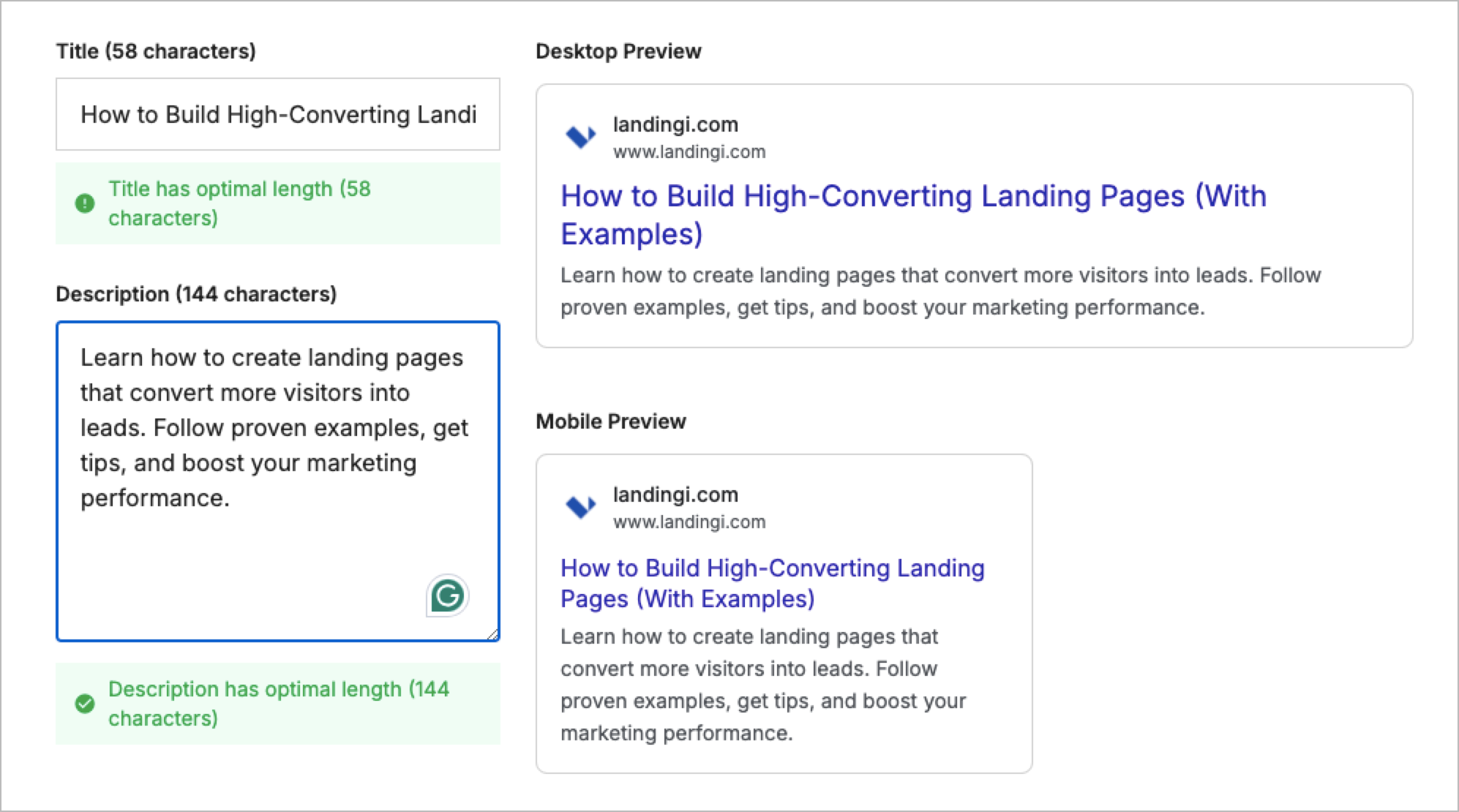 The Landingi SEO Title & Description Checker was built to help with exactly that. It lets you check the actual pixel length of your title tag and meta description, so you can see how they’ll look in real search results both on desktop and mobile. You can enter a live URL or write from scratch, adjust the copy, and instantly preview your snippet before publishing.