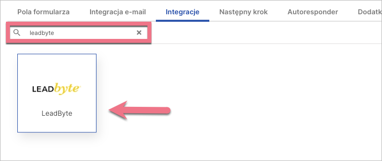 3. W zakładce Integracje wybierz LeadByte. Wpisz nazwę integracji w wyszukiwarce i kliknij enter.