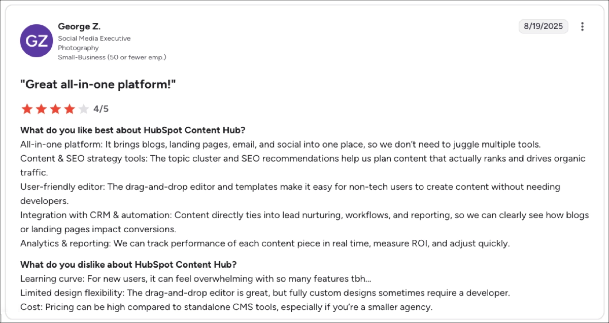 Essa estrutura multifuncional é o motivo pelo qual muitas empresas começam com a HubSpot, mas também torna a plataforma pesada e cara em comparação com alternativas mais focadas. Várias limitações relatadas pelos usuários incluem a complexidade do editor, regras rígidas de layout e um modelo de preço progressivo que cresce rapidamente com o número de contatos.
