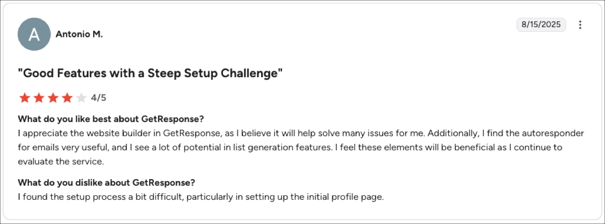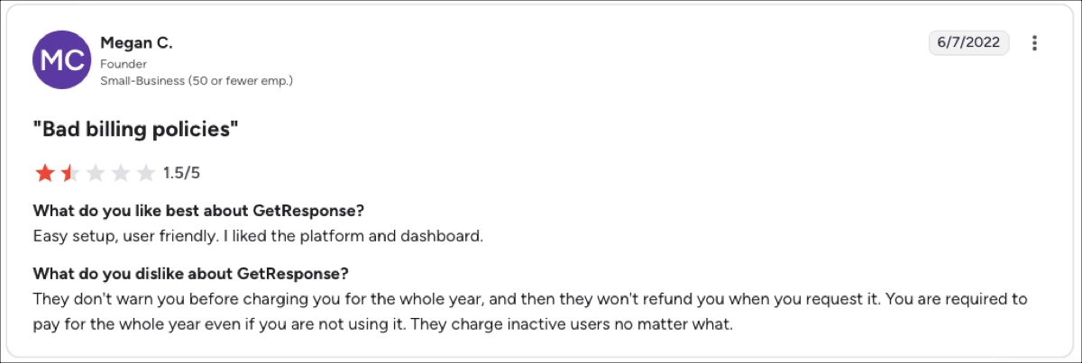 Uma preocupação recorrente são as regras rígidas de conformidade que podem levar a bloqueios inesperados de contas ou listas, mesmo para remetentes legítimos. Isso pode interromper campanhas sem aviso prévio. Para alguns usuários, isso faz com que a GetResponse pareça imprevisível em comparação com outras ferramentas de marketing por e-mail.